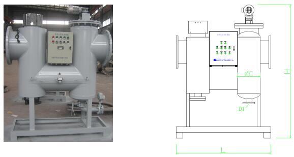 3.多相全程水处理器的结构特点:由优质碳钢筒体和特殊结构的不锈钢网组成,配以自动换向系统、自动排污系统、电器及功能转换元件。其过滤单元分为主过滤腔、反洗过滤腔、排污腔、和重颗粒收集腔。该机设有两个排污口,排污腔出口设有电动排污口,接受电信号后自行排污,是主排污口;另一个排污口设在机器底部,由手动排污,每个采暖季排污2-3次。